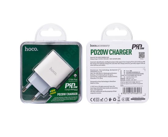 Адаптер Сетевой Hoco C76A Plus 1TYPE-C/5V/3A PD+QC3.0 (white) (207587)