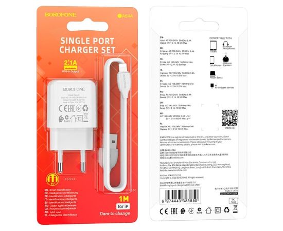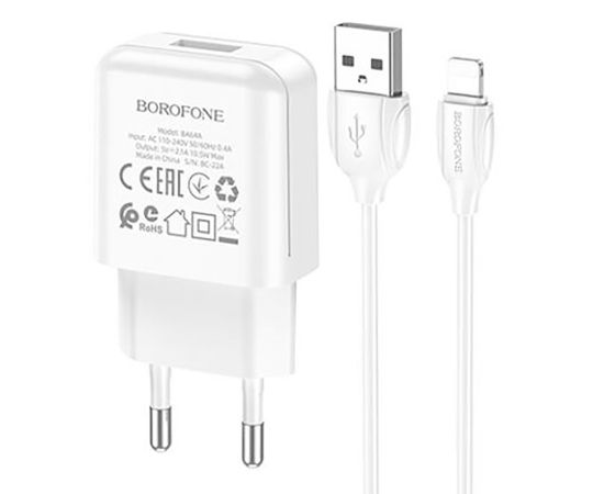 Адаптер Сетевой с кабелем Borofone BA64A USB 2,1A/5W (USB/Lightning) (white) (213525)