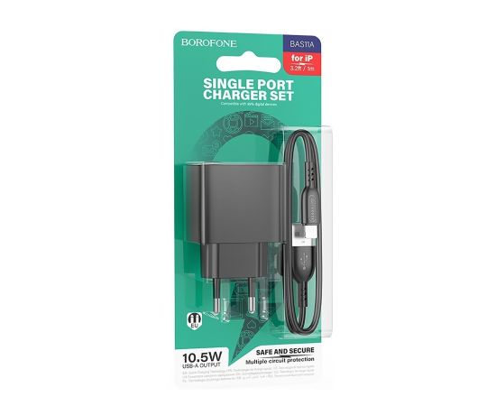 Адаптер Сетевой с кабелем Borofone BAS11A Erudite USB 2,1A/10,5W (USB/Lightning) (black) (225091)