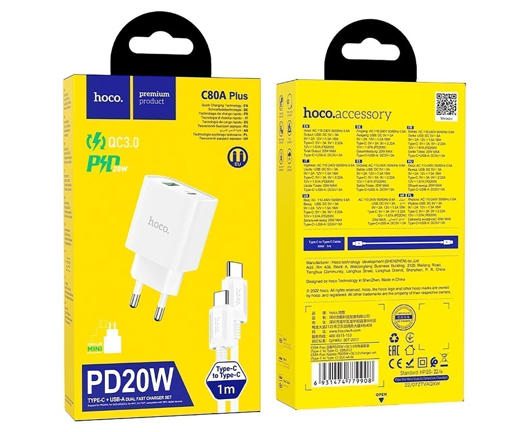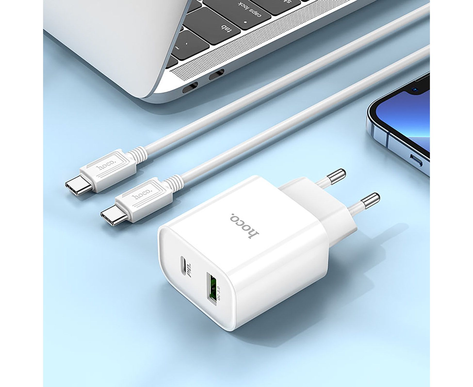 Адаптер Сетевой с кабелем Hoco C80A Plus Rapido PD USB/Type-C 20W (Type-C/Type-C) (white) (221589)