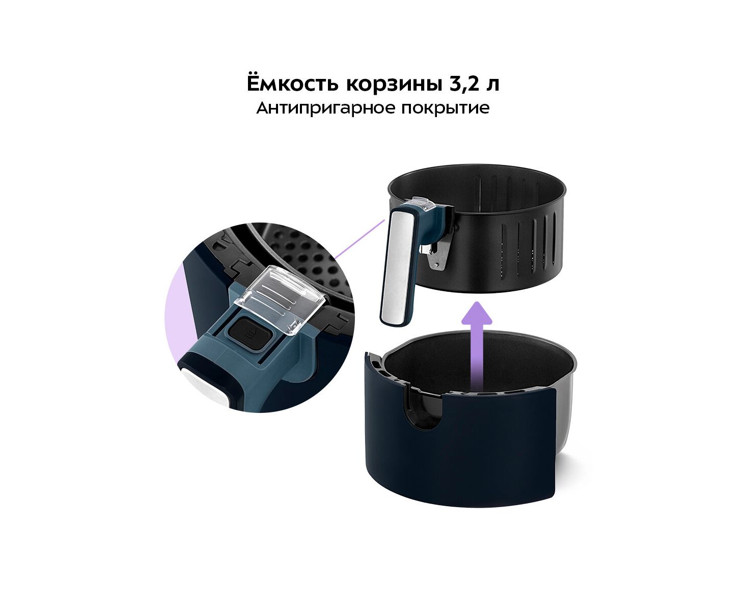 Корзина и поддон имеют антипригарное покрытие. Поддон и корзина легко вынимаются и моются, а на ручке корзины расположена кнопка-блокиратор, предотвращающая случайное отсоединение корзины от поддона.