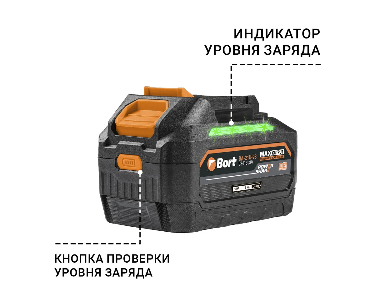 - Индикатор заряда Для дополнительного удобства аккумулятор BORT BA-21U-93 оснащен индикатором заряда, который позволяет в реальном времени отслеживать уровень заряда. Это упрощает планирование работы и позволяет избежать неожиданных остановок в процессе выполнения задач.