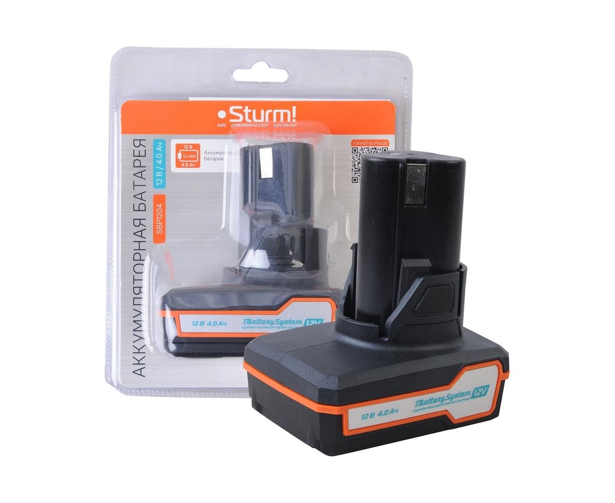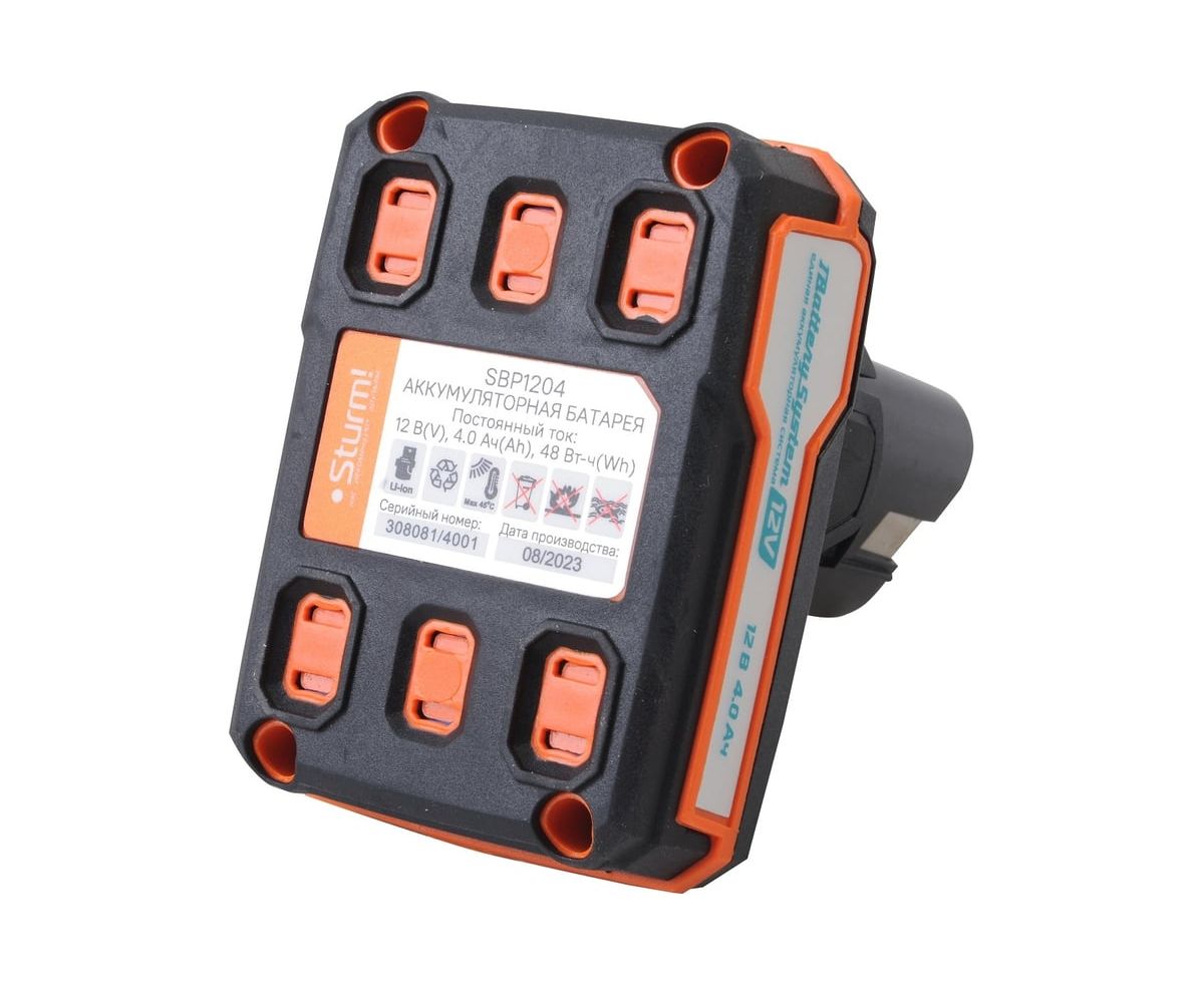 12-вольтовый аккумулятор SBP1204 Sturm! емкостью 4.0 Ач обеспечивает впечатляющую мощность при минимальных размерах и совместим с любым инструментом единой аккумуляторной системы 1BatterySystem12V.
