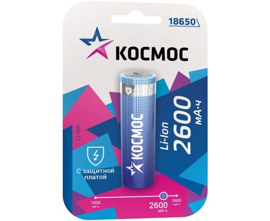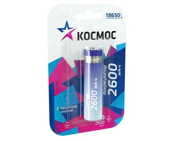 Аккумулятор Космос 18650 Li-ion 2600mAh KOC18650Li-ion26US2 без защиты, 2шт шринк