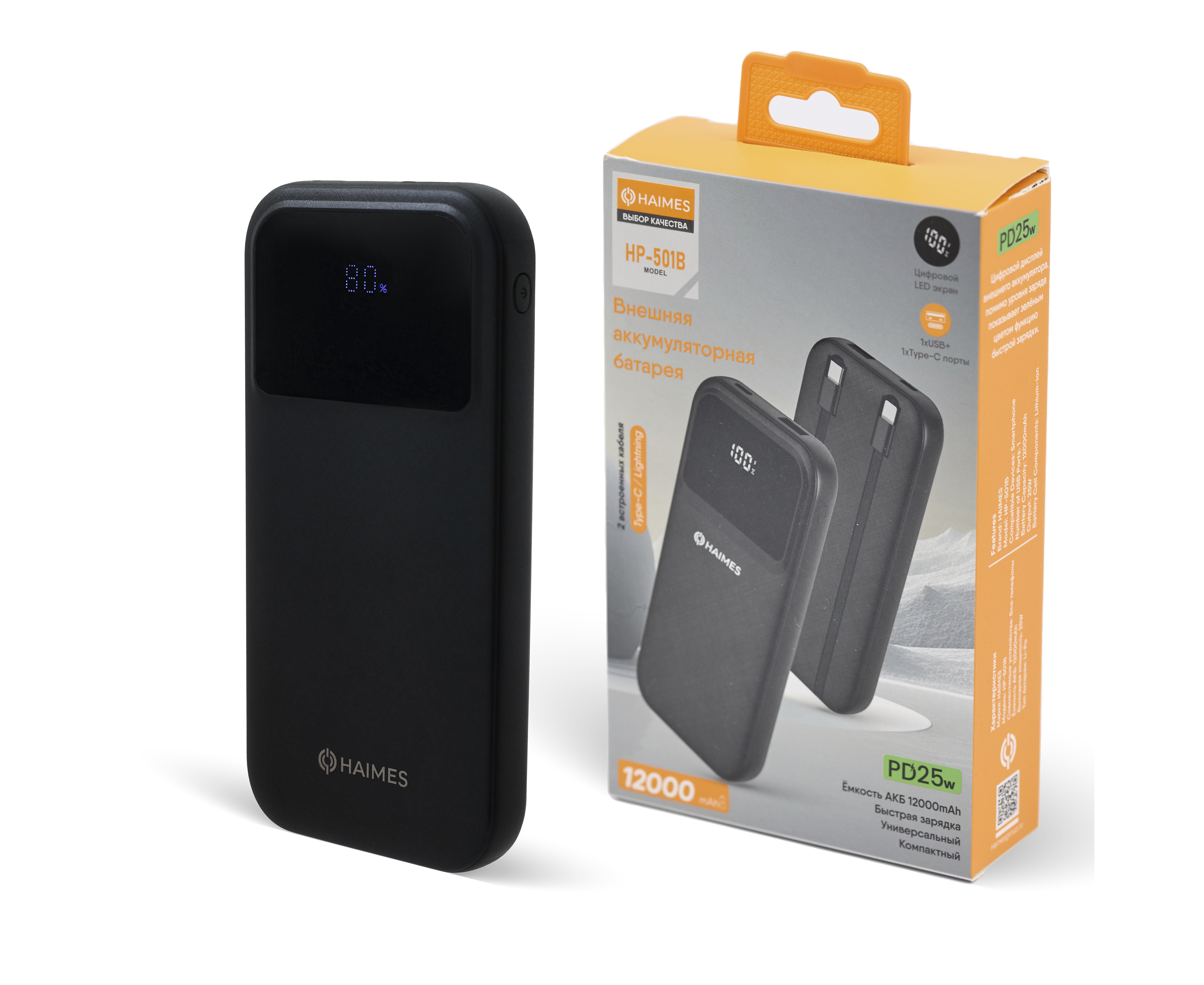 Аккумулятор внешний резервный, быстрая зарядка 25W, 12000 Mah, HAIMES, черный