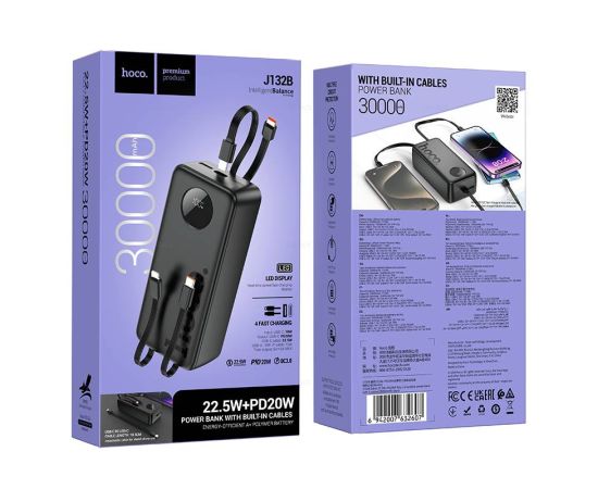 Аккумулятор внешний резервный HOCO J132B Sabio 22.5W+PD20W fully compatible power bank with 3 cables(30000mAh) (черный)