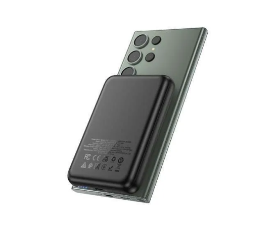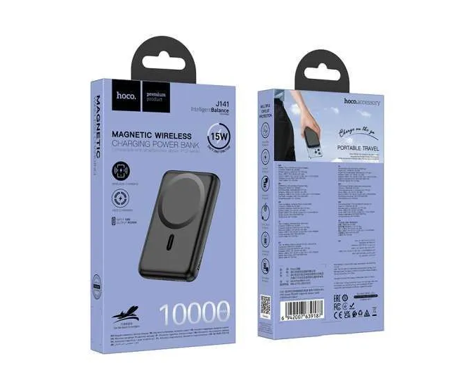 Hoco J141 - это мобильный блок питания, который предлагает удобное сочетание функций магнитной беспроводной зарядки с поддержкой MagSafe и простой беспроводной зарядки для всех остальных устройств, поддерживающих функцию беспроводной зарядки Qi. Также вы можете просто заряжать любой гаджет посредством подключения кабеля.