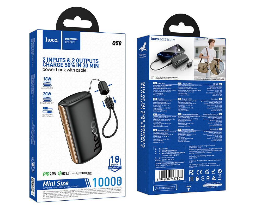Аккумулятор внешний резервный HOCO Q50 Victory PD20W power bank with cable(10000mAh) (черный)