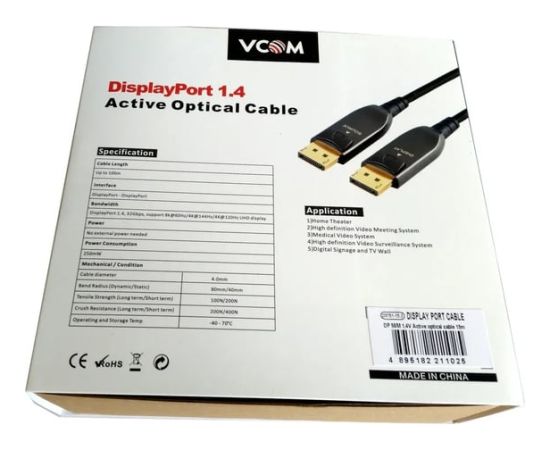 Высокоскоростной активный оптический кабель DisplayPort версии 1.4 применяется для соединения компьютеров, Blue-Ray и DVD плейеров, игровых консолей, видео и фото камер с телевизорами, мониторами, видео проекторами и предназначен для передачи аудио и видео сигнала
