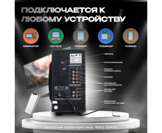 Система поддерживает различные режимы воспроизведения, включая Bluetooth, внешний накопитель, Aux, Система также оснащена различными разъемами, включая USB, SD, Auх тюлпан, ARC in и Optical in. Это позволяет подключить различные устройства и наслаждаться музыкой или фильмами с разных источников.