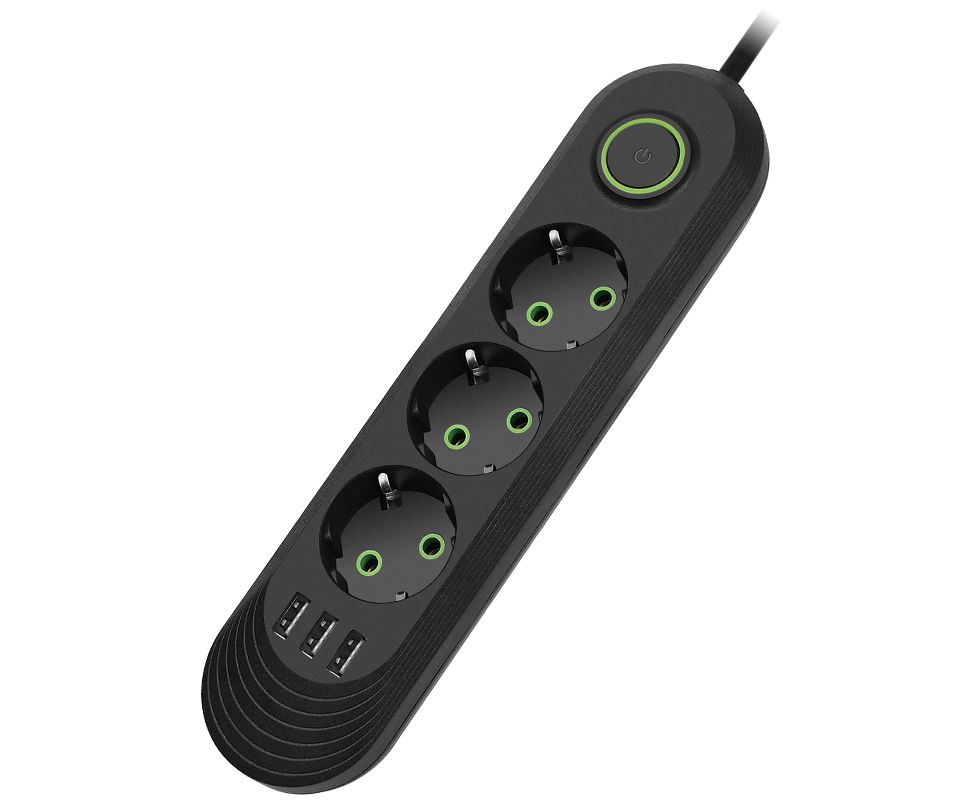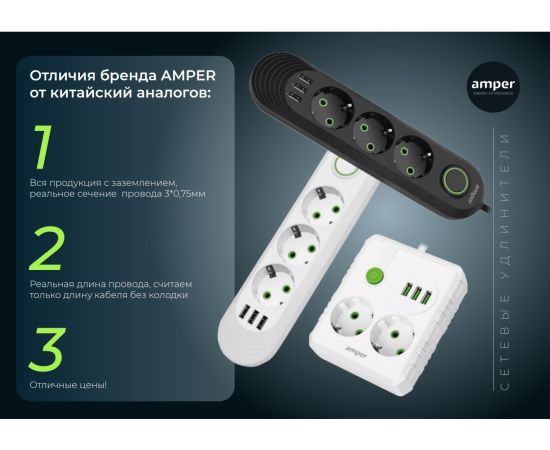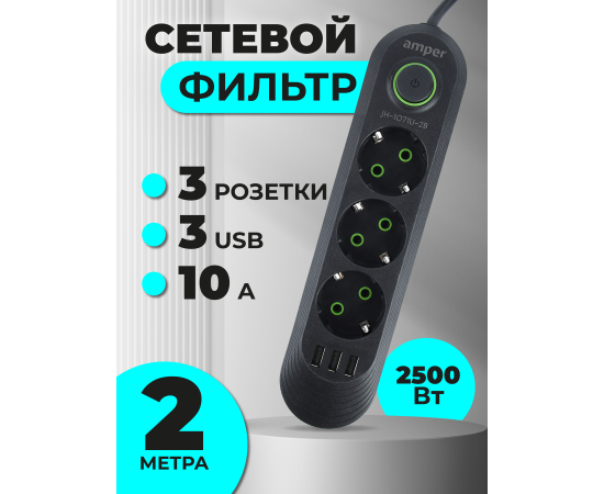 Сетевой удлинитель Amper , 2,0м, 3 розетки, 3*0,75мм, 10А, 2500 Вт, 3usb, черный