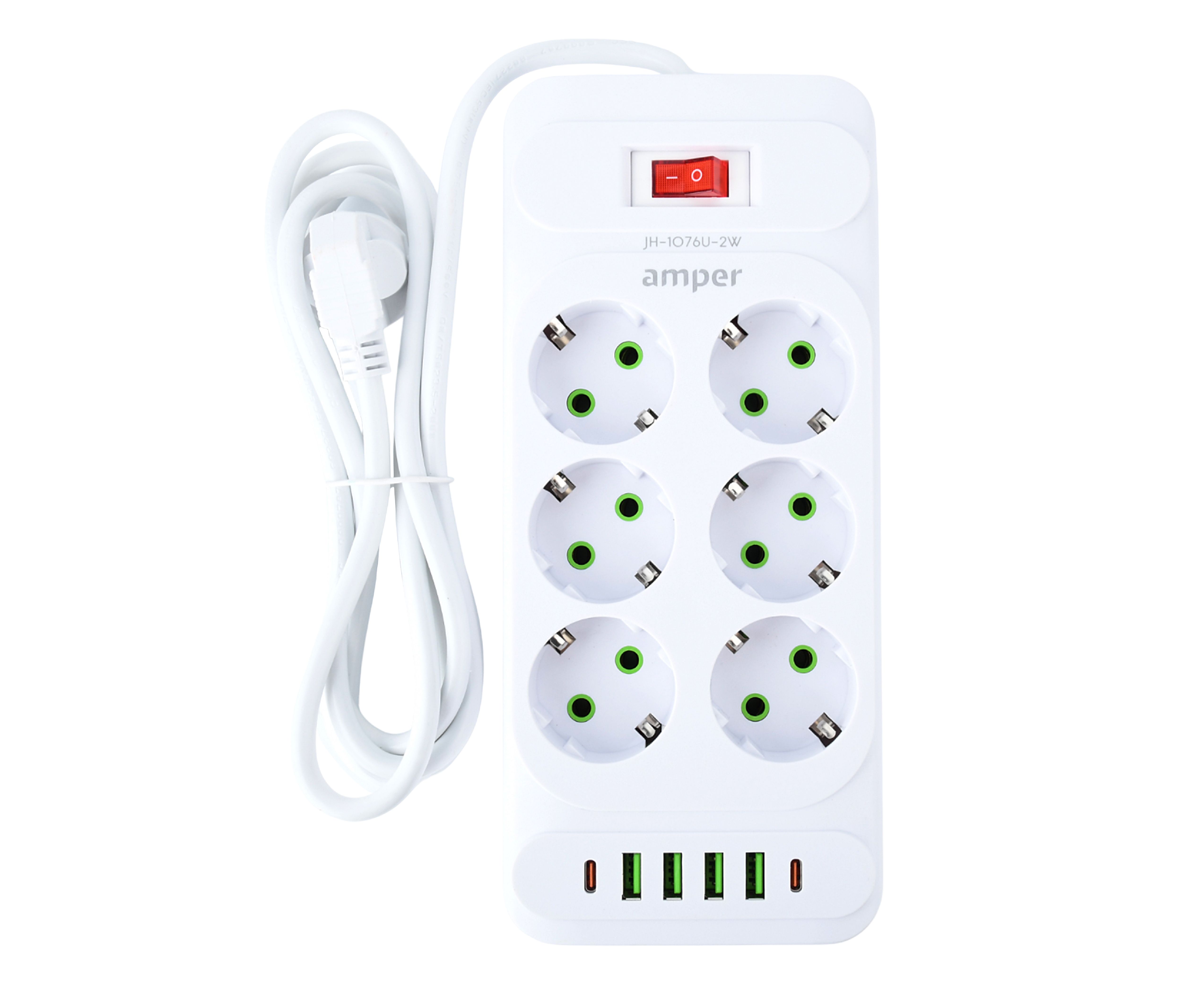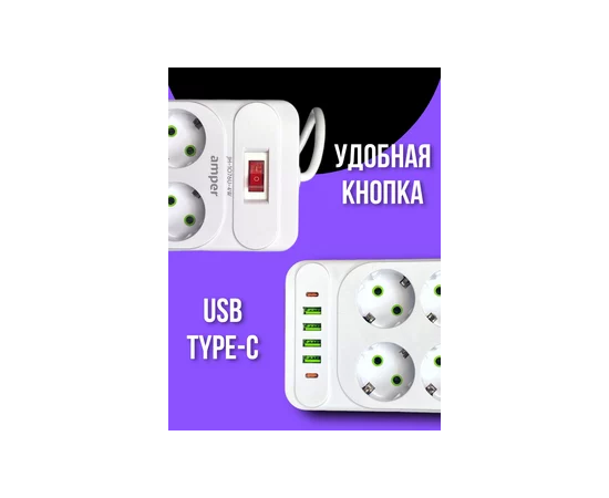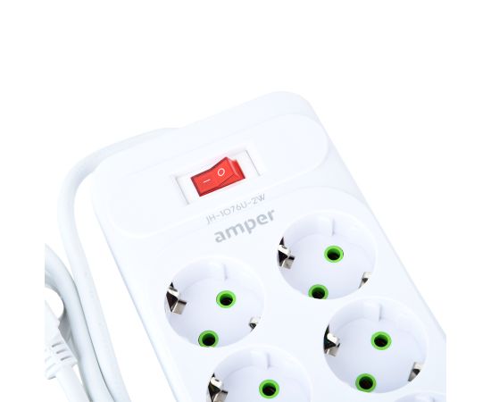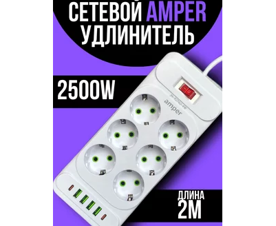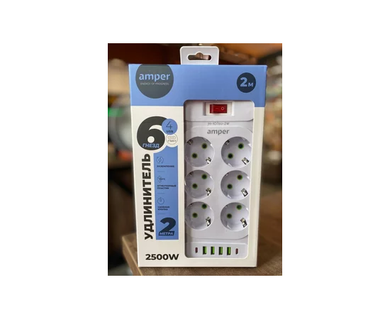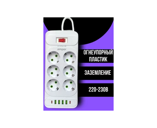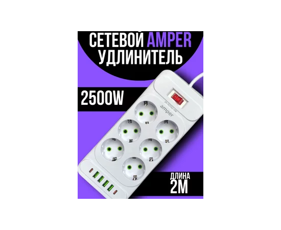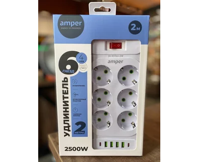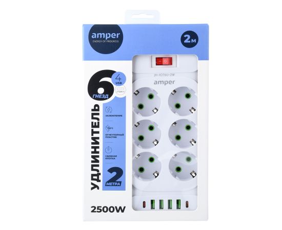 Сетевой удлинитель Amper 2,0м, 6 розеток, 10А, 2500 Вт, 4usb,2Type-C, белый