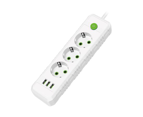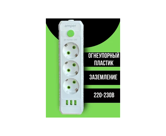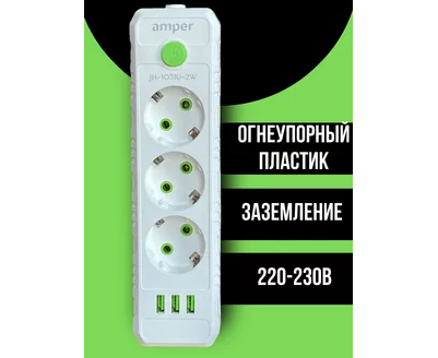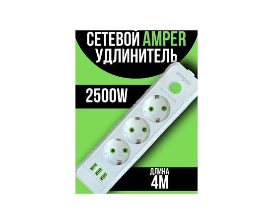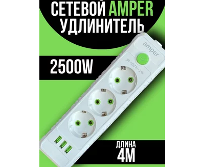 Сетевой удлинитель Amper 4,0м, 3 розетки, 10А, 2500 Вт, 3usb, белый