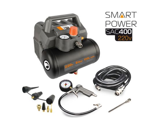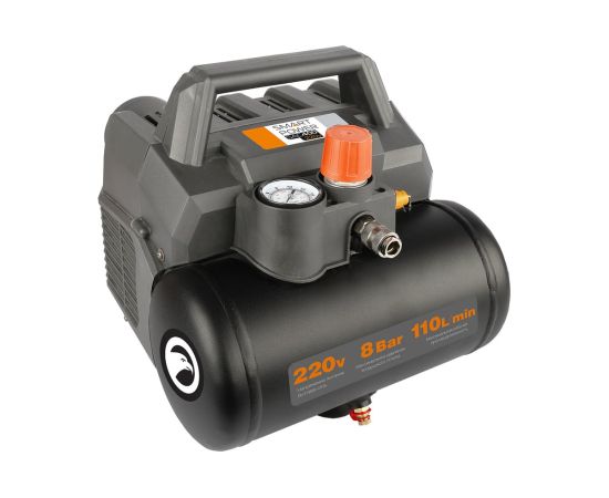 Данный компрессор отличается чрезвычайно низким шумом работы – около 50 дБ (тихий человеческий голос), компактностью и функциональностью. За счет он будет востребован в быту, в квартире, небольшой мастерской или даже производственной лаборатории. При помощи SAC-400 можно накачивать шины, работать с пневмоинструментом (пневмостеплерами и нейлерами), пользоваться для продувки. Он может быть также применен с краскопультом и аэрографом. В основе конструкции две поршневые камеры, установленные по разным сторонам электродвигателя. Компрессор не требует обслуживания (безмасляный) и характеризуется высокой производительностью 110 л/мин и низкой мощностью потребления 600 Вт. Устройство имеет крепкий пластиковый кожух, защищающий внутренние компоненты, ресивер емкостью 6 литров, а также удобную рукоятку для переноски. Регулятор давления на выходе позволяет точно подобрать рабочее давление под любой пневмоинструмент. Компрессор BERKUT SAC-400 поставляется в комплекте с армированным пневмошлангом, пистолетом для подкачки и другими дополнительными аксессуарами.