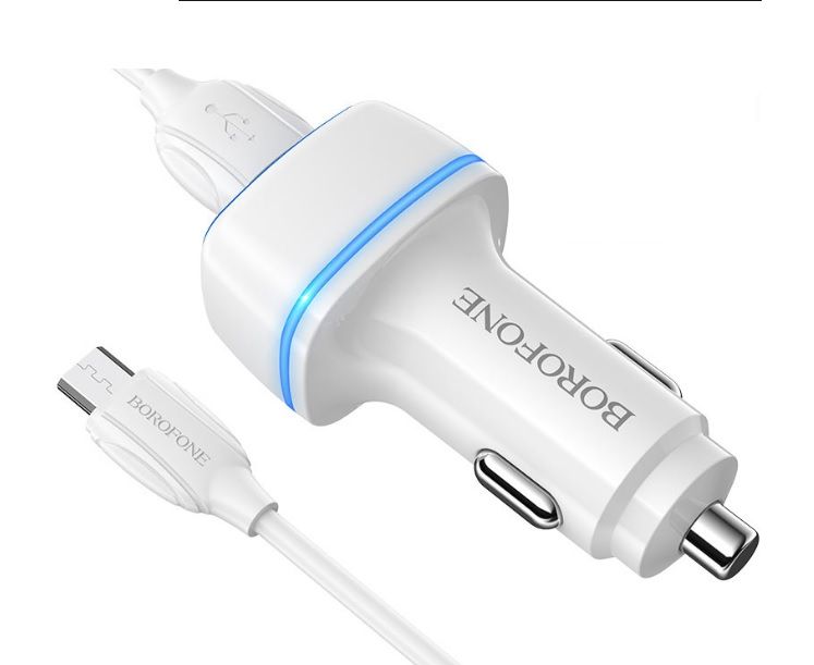 Автомобильное зарядное устройство Borofone BZ14 micro USB с двумя USB портами. Материал изготовление данного товара ABC пластик + PC огнеупорный, что не дает нагреться, перегреться. Оснащен LED индикатором синего света..