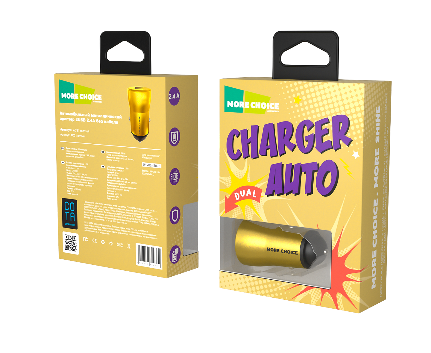 Материал: PC, ABS-пластик огнеупорный. Количество разъемов USB: 2 Вход: 12В/24В. Максимальный выходной ток: 2.4A Комплектация: автомобильное зарядное устройство, LED лампа, буклет. Цвета: Black, Gold, Silver