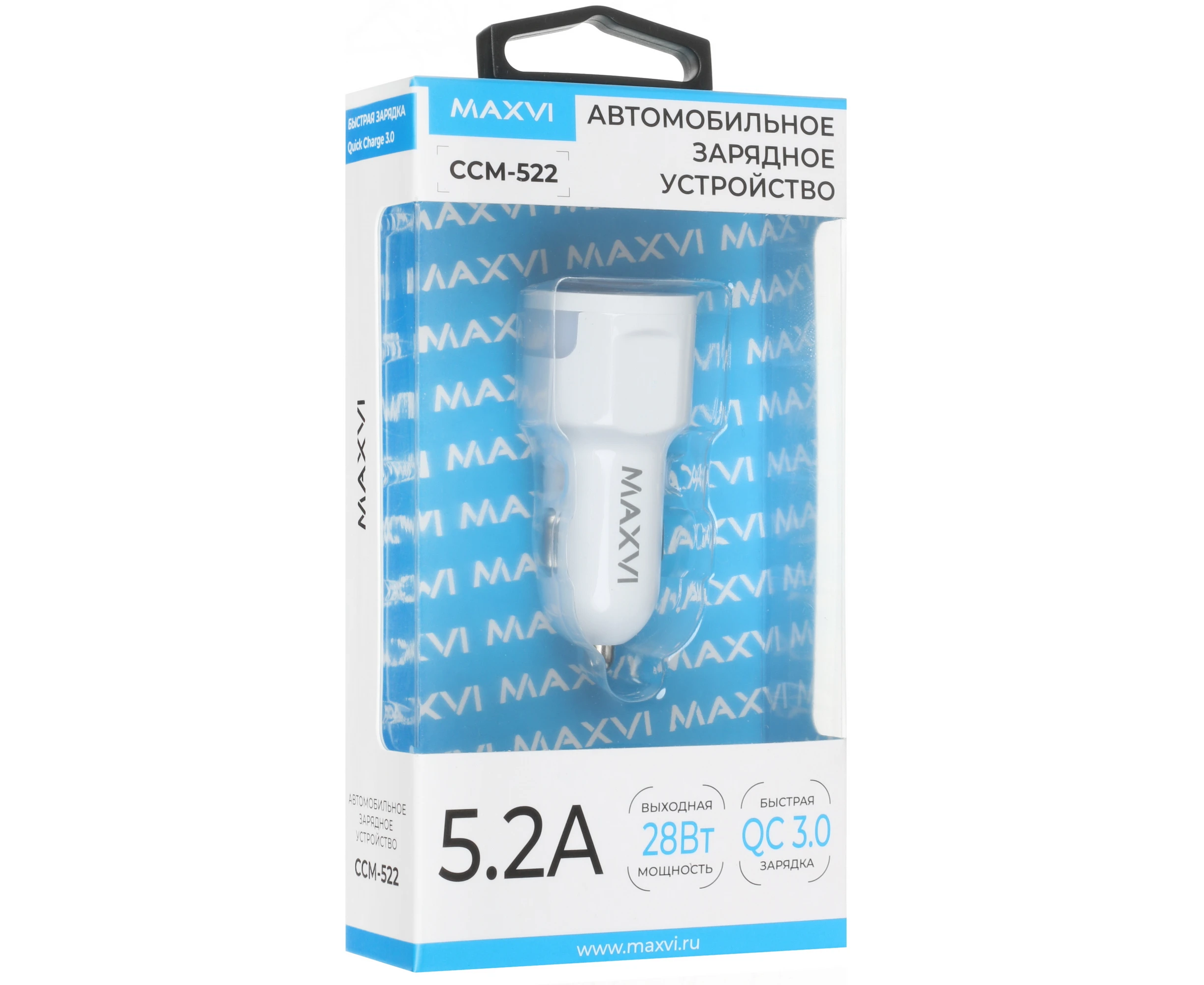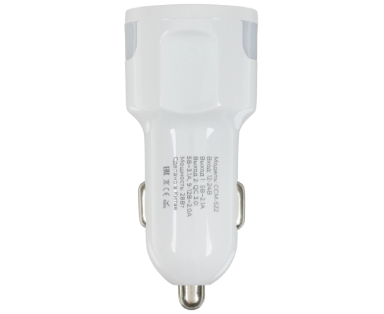 АЗУ Maxvi CCM-522 white 5.2A, 2xUSB, QC3.0 подсветка синяя