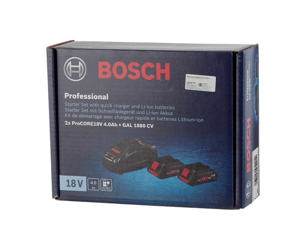 Набор аккумуляторов Li-Ion ProCORE 4 Ач, 18В + ЗУ GAL 1880 CV Professional Bosch 1600A016GF позволяет производить работы в сервисах и на стройках без простоя.