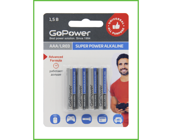 Щелочные батарейки универсального назначения GoPower SUPER POWER ALKALINE – это максимум энергии надолго и № 1 в России по соотношению «цена – качество». Благодаря новейшей технологии Powerlock и использованию премиальных компонентов из Японии, достигается минимальный саморазряд, поэтому батарейки GoPower SUPER POWER ALKALINE работают дольше и хранятся 10 лет без потери характеристик. Они идеально подходят для большинства современных устройств, включая гаджеты и устройства с высоким энергопотреблением. Батарейки безопасны для окружающей среды, так как не содержат примеси тяжелых токсичных металлов - свинца, кадмия и ртути.