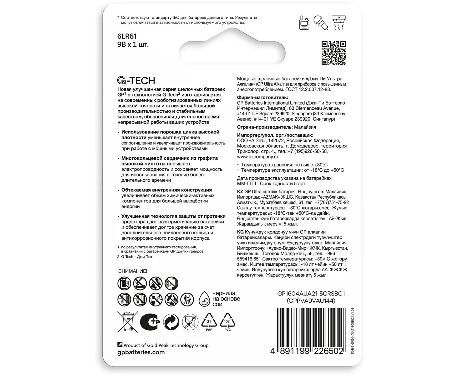 Батарея GP Ultra Alkaline 1604AUA21-5CRSBC1 9V (1шт) блистер