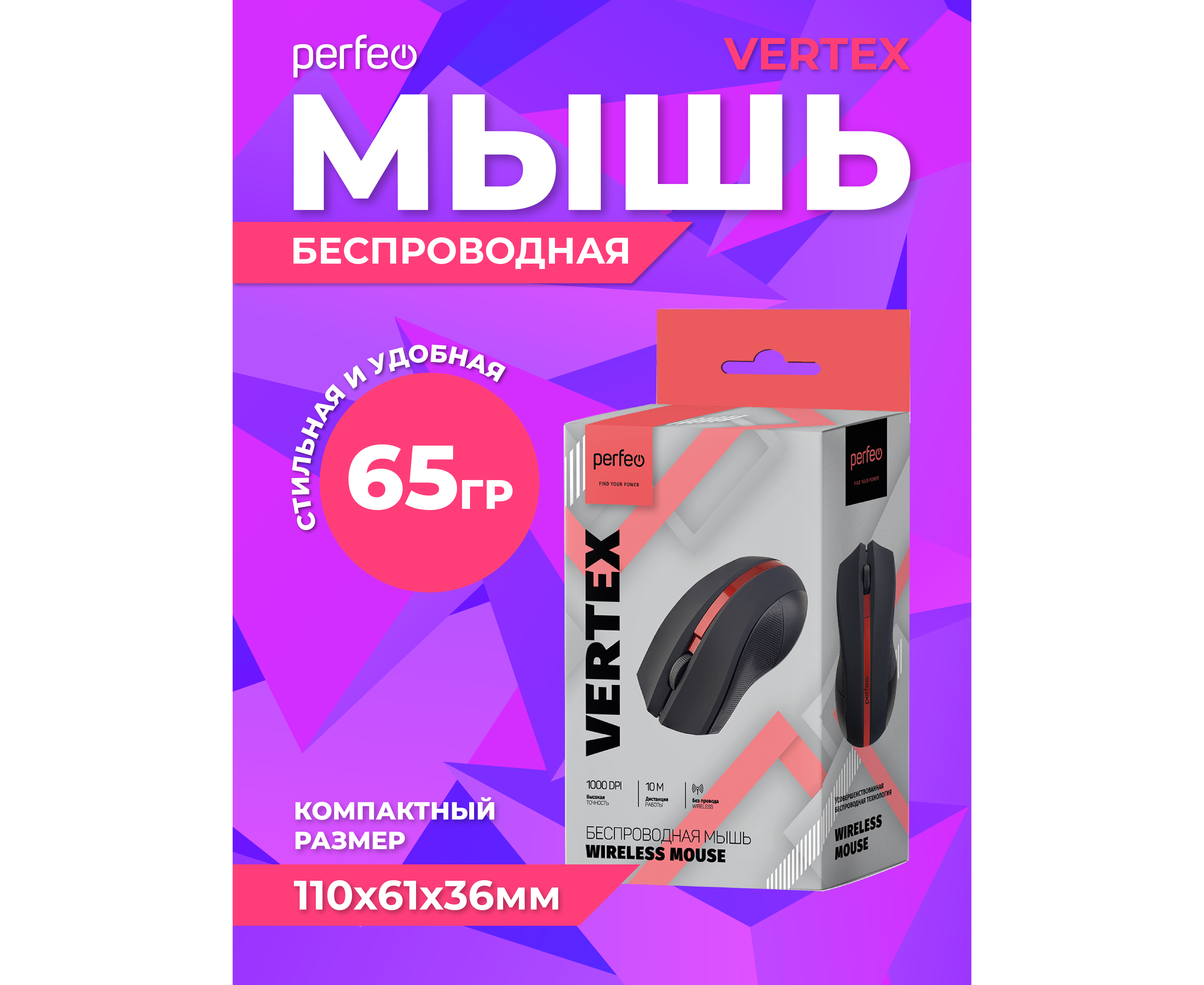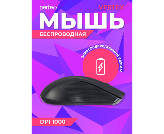 Большая, удобная беспроводная мышь Perfeo"VERTEX" идеально подходит для продолжительной работы. Приятное на ощупь Soft touch покрытие обеспечивает плотный контакт и отсутствие скольжения. Конструкция правой и левой кнопок с небольшим углублением. Мышь PERFEO "VERTEX" с усовершенствованной беспроводной технологией (радиочастота 2,4 ГГц, радиус работы до 10 м). Симметричная форма мыши подходит для правой и левой руки. Эргономичный дизайн обеспечит комфортную работу. Высокоточный сенсор с разрешением 1000 DPI. Plug'n'Play, не требуется установка ПО. Функция автоматического энергосбережения. Системные требования: Windows 10/8/7/XP, Mac OS, свободный порт USB.