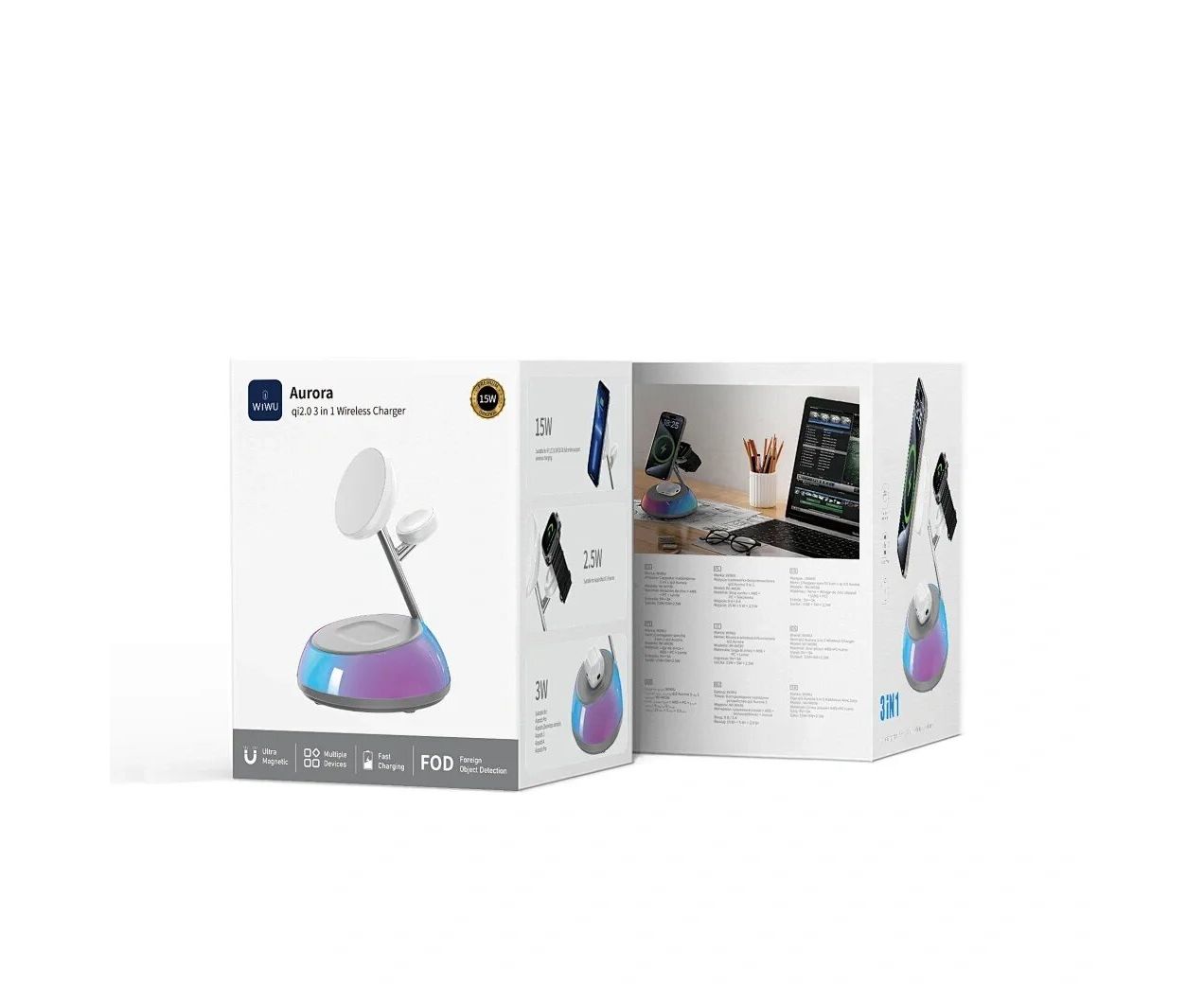 Беспроводная зарядка WIWU Wi-W036 Aurora Qi2 3in1 Wireless Charger White