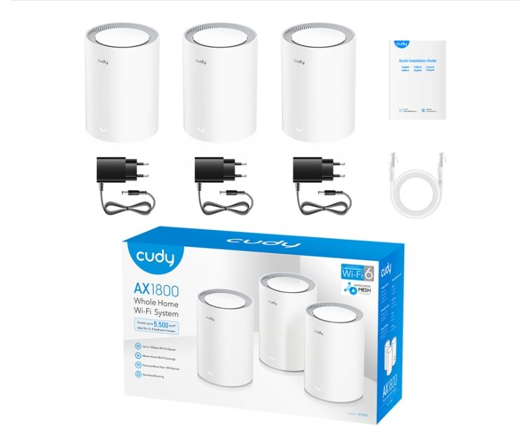 Модель Cudy M1800 (3-Pack) имеет в комплекте 3 шт роутеров Cudy М1800 с гигабитными портами Ethernet стандарта Wi-Fi 6 Mesh AХ1800.