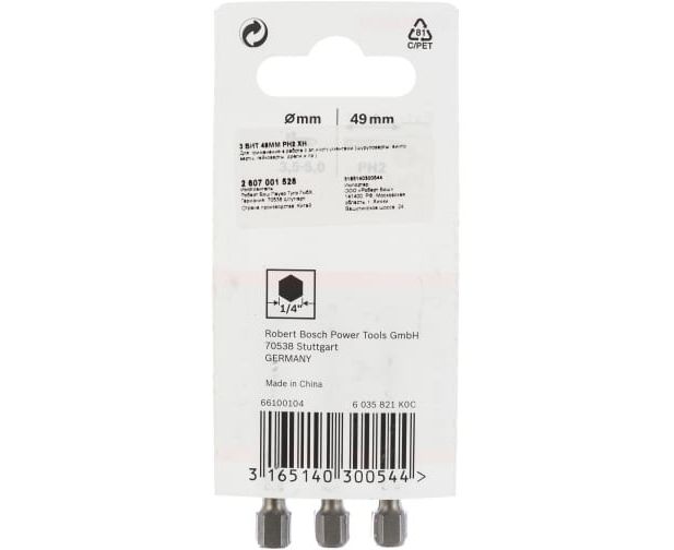 Биты Bosch Рh2 2607001528 6-ти гранный хвостик14", 49мм, 3шт