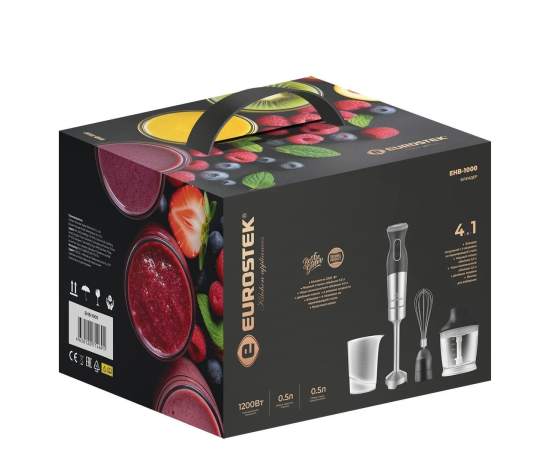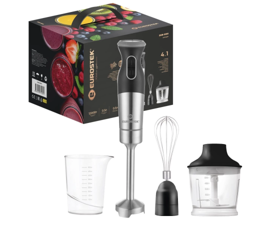 Блендер погружной EHB-1000. Мощность 1200 Вт, низкий уровень шума, 2 скорости, стальной нож, мерный стакан - 500мл, стальной венчик, измельчитель - 500мл