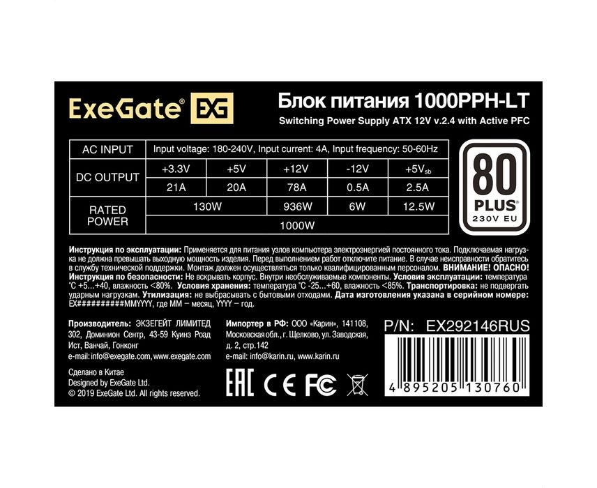 Блок питания ExeGate 1000PPH-LT EX292146RUS 1000W (ATX, APFC, КПД 82% (80 PLUS), 12cm fan, 24pin