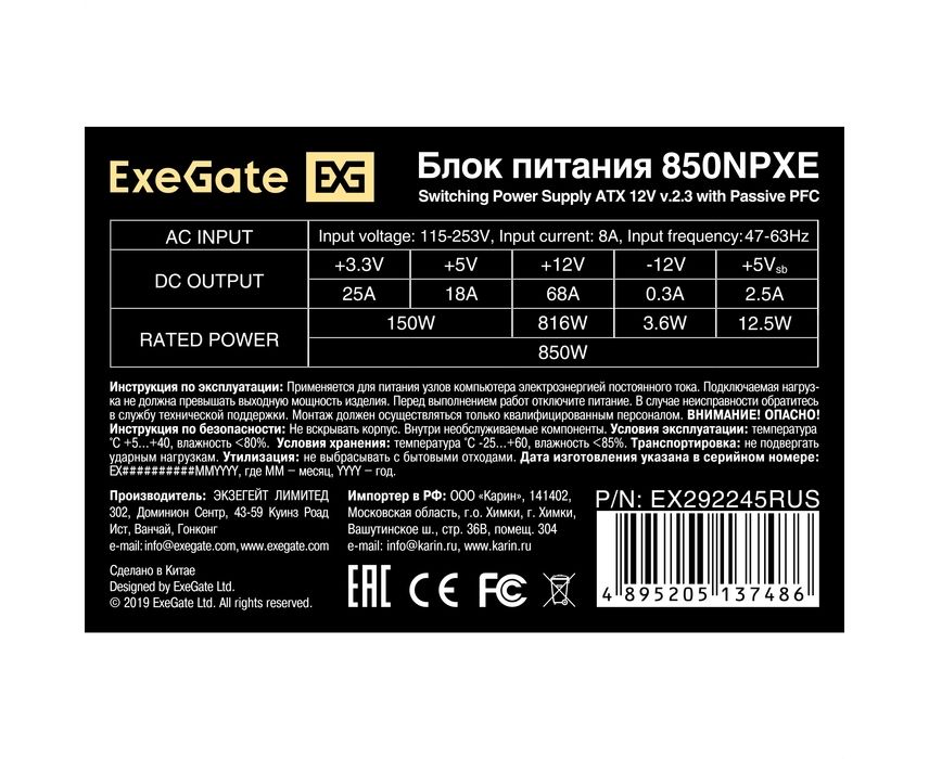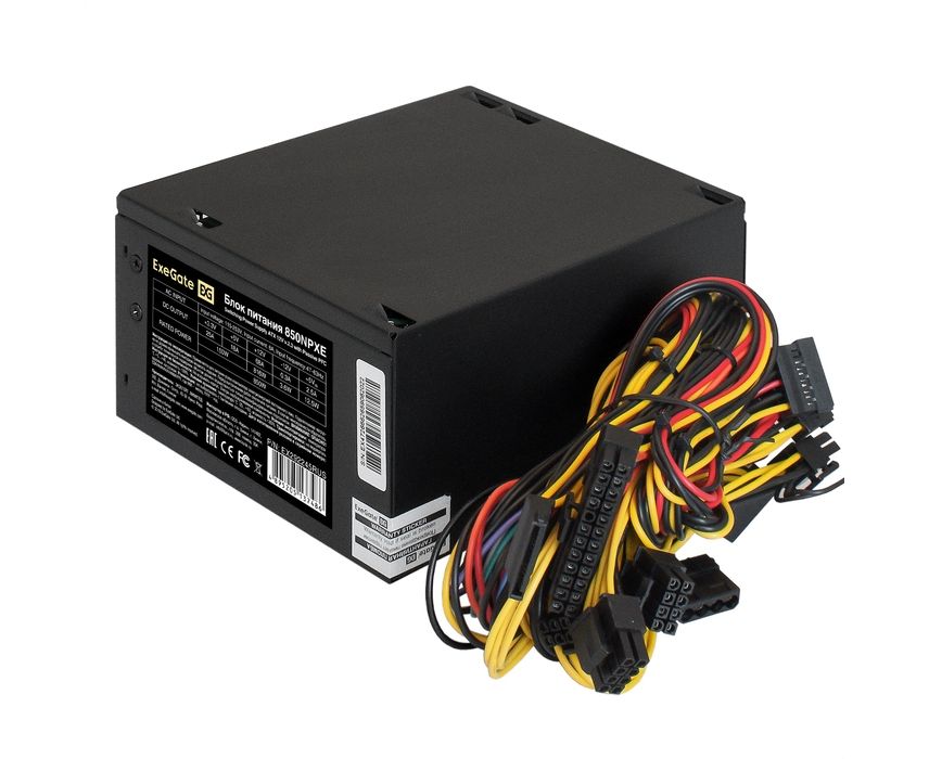 Блок питания ExeGate 850NPXE EX292245RUS 850W (ATX, PPFC, 12cm fan, 24pin, 2x(4+4)pin, 2xPCI-E, 5xSATA, 3xIDE, black)