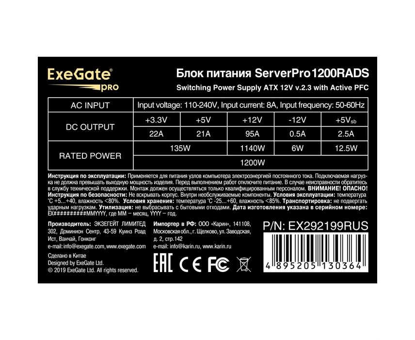 Блок питания ExeGate ServerPRO-1200RADS EX292199RUS 1200W (ATX, for 3U+ cases, КПД 82% (80 PLUS), 14cm fan