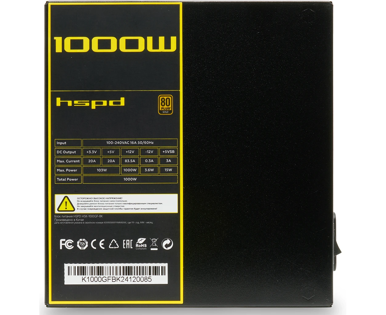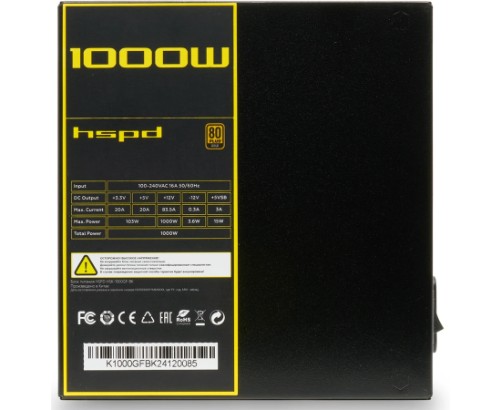 Блок питания HSPD HSK-1000GF-BK 1000W 80+ Gold (ATX, 2.52, Full modular, 1x24(20+4)pin mesh 550mm, 1xCPU*2 8(4+4)pin 650+150mm, 2xPCIe*2 8(6+2)pin