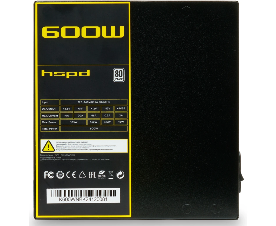 Блок питания HSPD HSK-600WN-BK 600W 80+ White (ATX, 2.52, Non-modular, 1x24(20+4)pin 500mm, 1xCPU 8(4+4)pin 550mm, 1xPCIe*2 8(6+2)pin 500+150mm