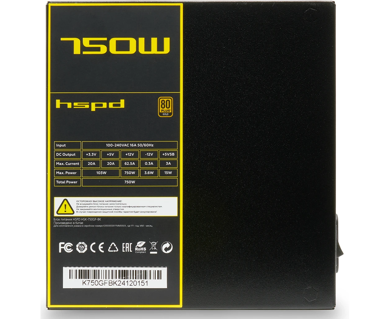 Блок питания HSPD HSK-750GF-BK 750W 80+ Gold (ATX, 2.52, Full modular, 1x24(20+4)pin mesh 550mm, 1xCPU*2 8(4+4)pin 650+150mm, 2xPCIe*2 8(6+2)pin