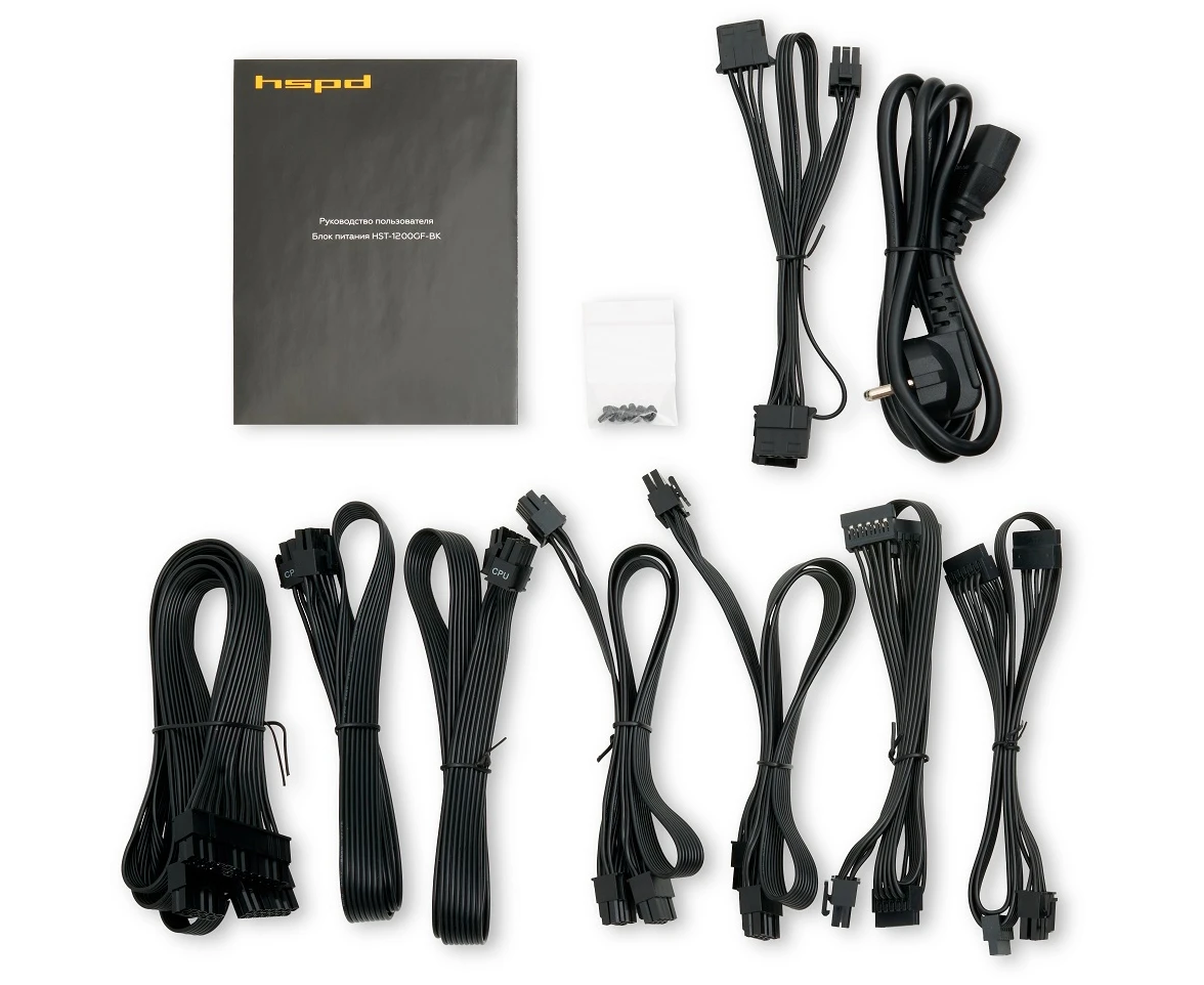 Блок питания HSPD HST-1200GF-BK 1200W 80+ Gold (ATX, 2.52, Full modular, 1x24(20+4)pin 600mm, 2xCPU 8(4+4)pin 700mm, 2xPCIe*2 8(6+2)pin