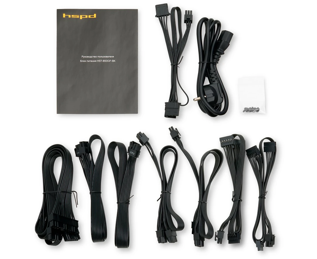 Блок питания HSPD HST-850GF-BK 850W 80+ Gold (ATX, 2.52, Full modular, 1x24(20+4)pin 600mm, 2xCPU 8(4+4)pin 700mm, 2xPCIe*2 8(6+2)pin