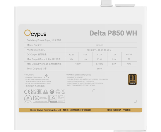 Блок питания Ocypus Delta P850 WH, 850W, APFC, 80+ Bronze, ATX 3.1, 120mm Fan