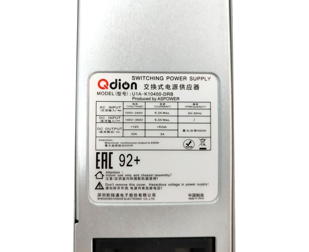 Блок питания Qdion U1A-K10400-DRB 1U Slim 400W (ШВГ=50.5*40*196mm), 80+ Golg, Oper.temp 0C~50C, AC/DC dual input