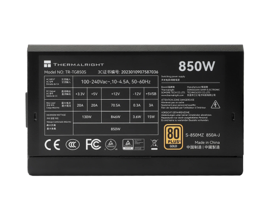 Блок питания Thermalright TR-TG850S 850W 80+ Gold (ATX, 3.0, PCIe 5.0, Non-modular, 1x24(20+4)pin, 1xCPU 8(4+4)pin, 2xPCIe*2 8(6+2))