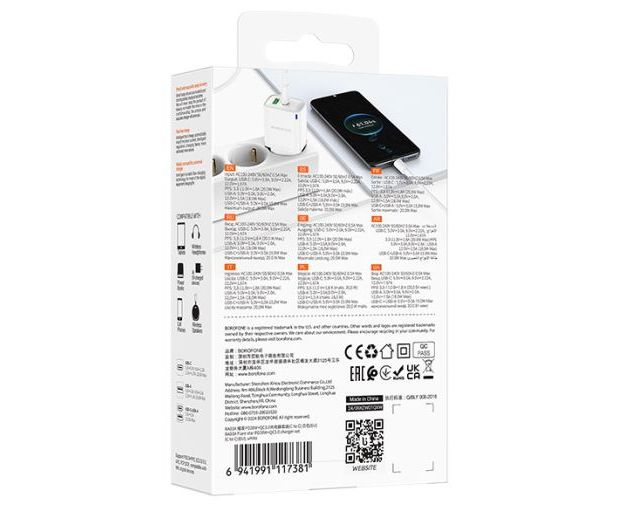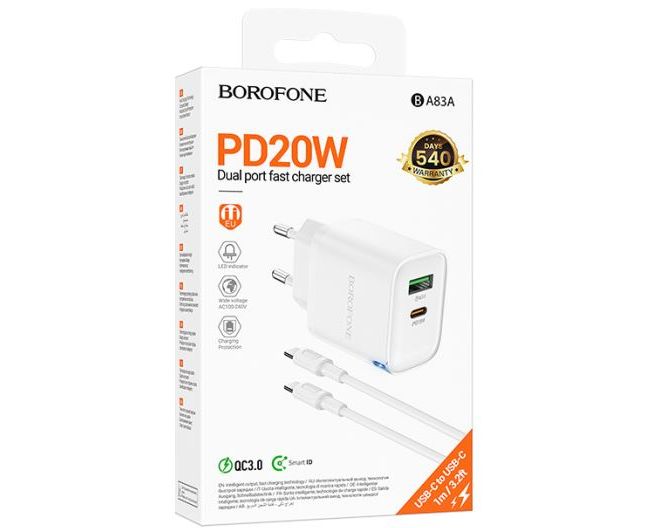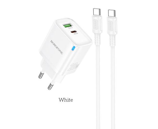 Сетевое зарядное устройство BOROFONE BA83A/ СЗУ + Кабель Type-C-Type-C/ PD + QC 3.0/ 2 USB/ 20W/ Белый – компактное и мощное решение для быстрой зарядки ваших устройств.
