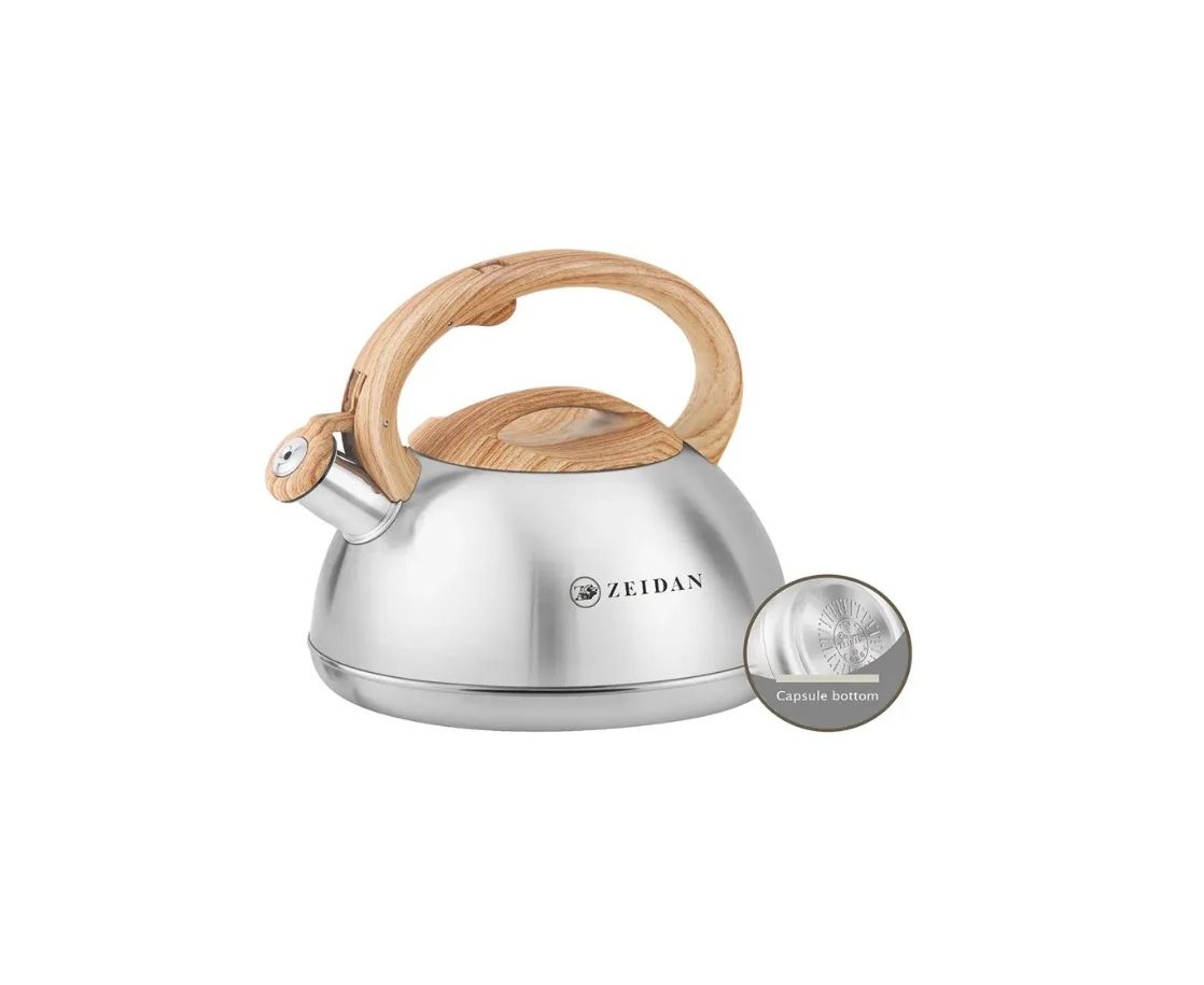Чайник со свистком ZEIDAN Z-4546 объемом 3,0 литра изготовлен из прочной нержавеющей стали, что обеспечивает долговечность и устойчивость к коррозии. Оснащен индукционным капсулированным дном, которое быстро и равномерно нагревается на любой плите, включая индукционные. Курковый механизм позволяет легко открыть крышку одной рукой, делая процесс закипания воды максимально удобным. Фиксированная ручка с мягким покрытием soft-touch «под дерево» обеспечивает надежный захват и комфорт при использовании, предотвращая риск ожогов и скольжения. Стильный дизайн и практичные функции делают этот чайник отличным помощником на любой кухне. Объем 3 литра идеально подходит для приготовления большого количества горячей воды для семьи или гостей. Высокое качество материалов и современные технологии производства гарантируют долговечность и безопасность эксплуатации.