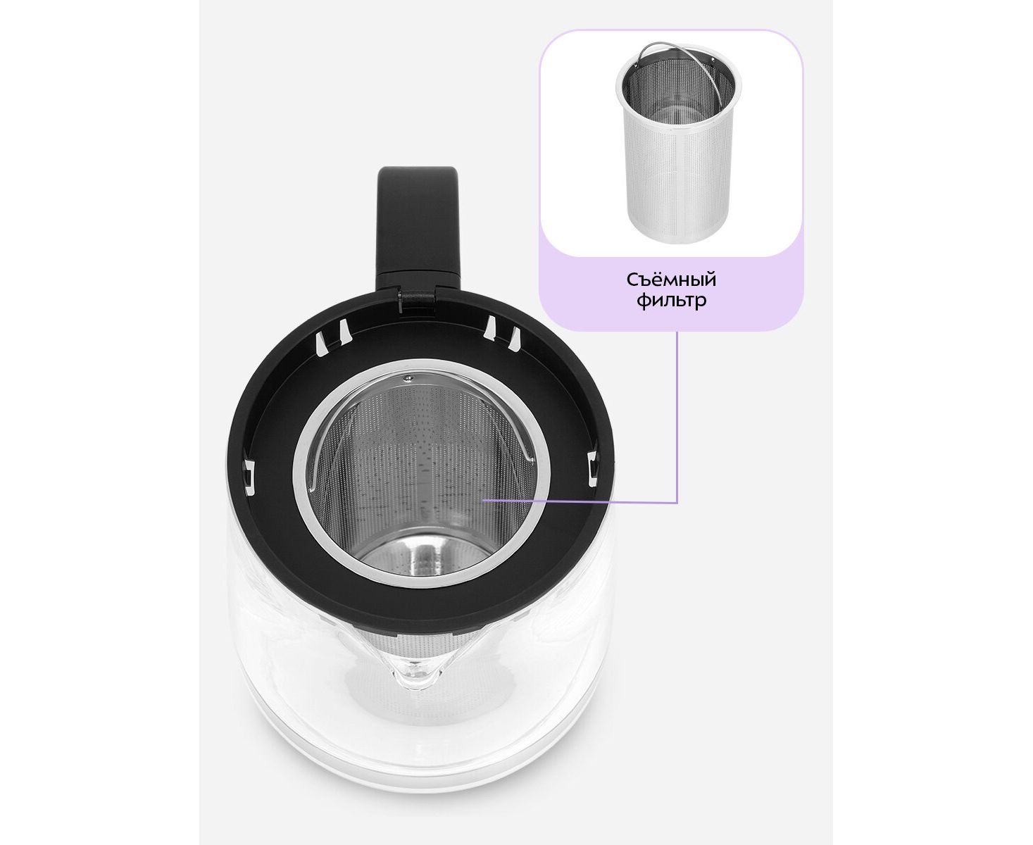 Заварочный чайник изготовлен из термостойкого стекла и имеет съёмный фильтр из нержавеющей стали для чая или кофе. В месте установки заварочного чайника на базе находится платформа с подогревом.
