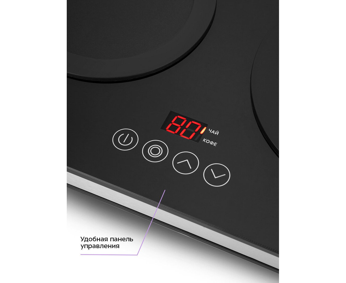 На базе расположена панель управления с сенсорными кнопками для выбора режима работы и установки температуры платформы с подогревом.
