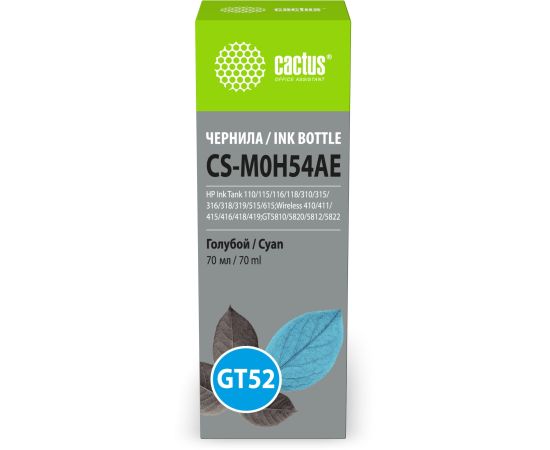 Чернила Cactus CS-M0H54AE GT52 голубой 70мл для HP Ink Tank 110/115/116/118/310/315/316/318/319/515/615;Wireless 410/411/415/416/418/419;GT5810/5820/5812/5822