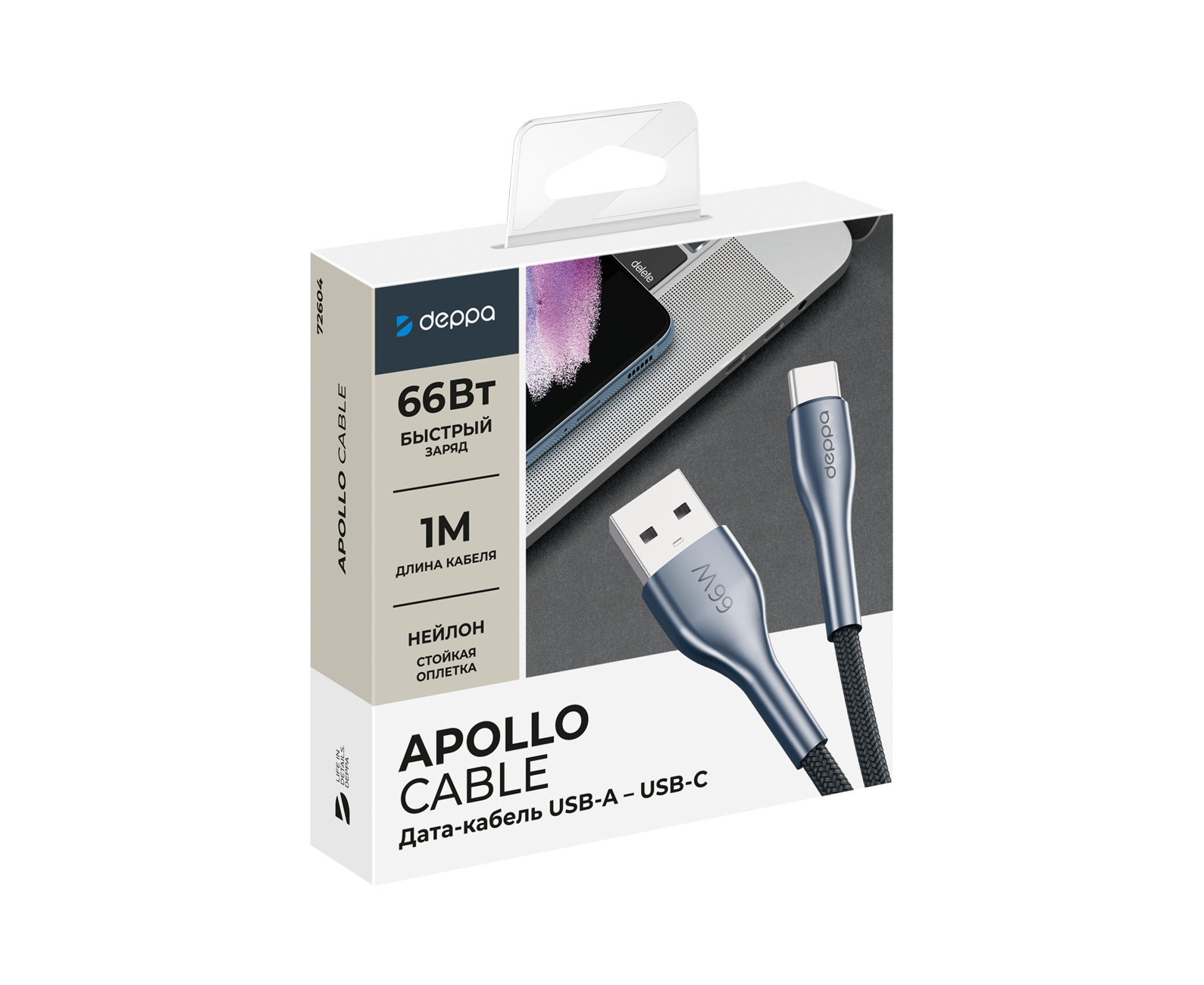 Дата-кабель Apollo USB-А - USB-С, 66Вт, 1м, черный, Deppa