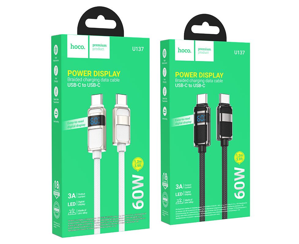 U137 Line, Type-C на Type-C зарядный дата кабель, поддержка быстрой зарядки PD 60W, LED цифровой дисплей, нейлоновая оплётка и коннекторы из цинкового сплава, длина – 1.2м