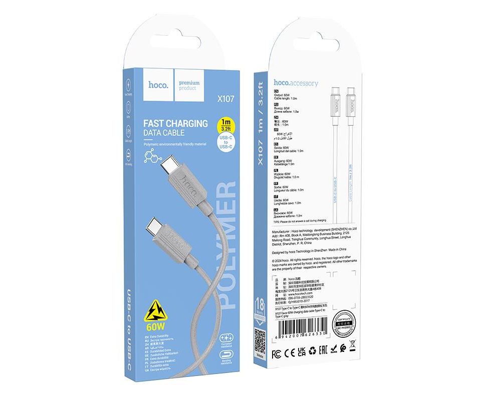 Дата-кабель HOCO X107 Favor 60W charging data cable Type-C + Type-C (серый)