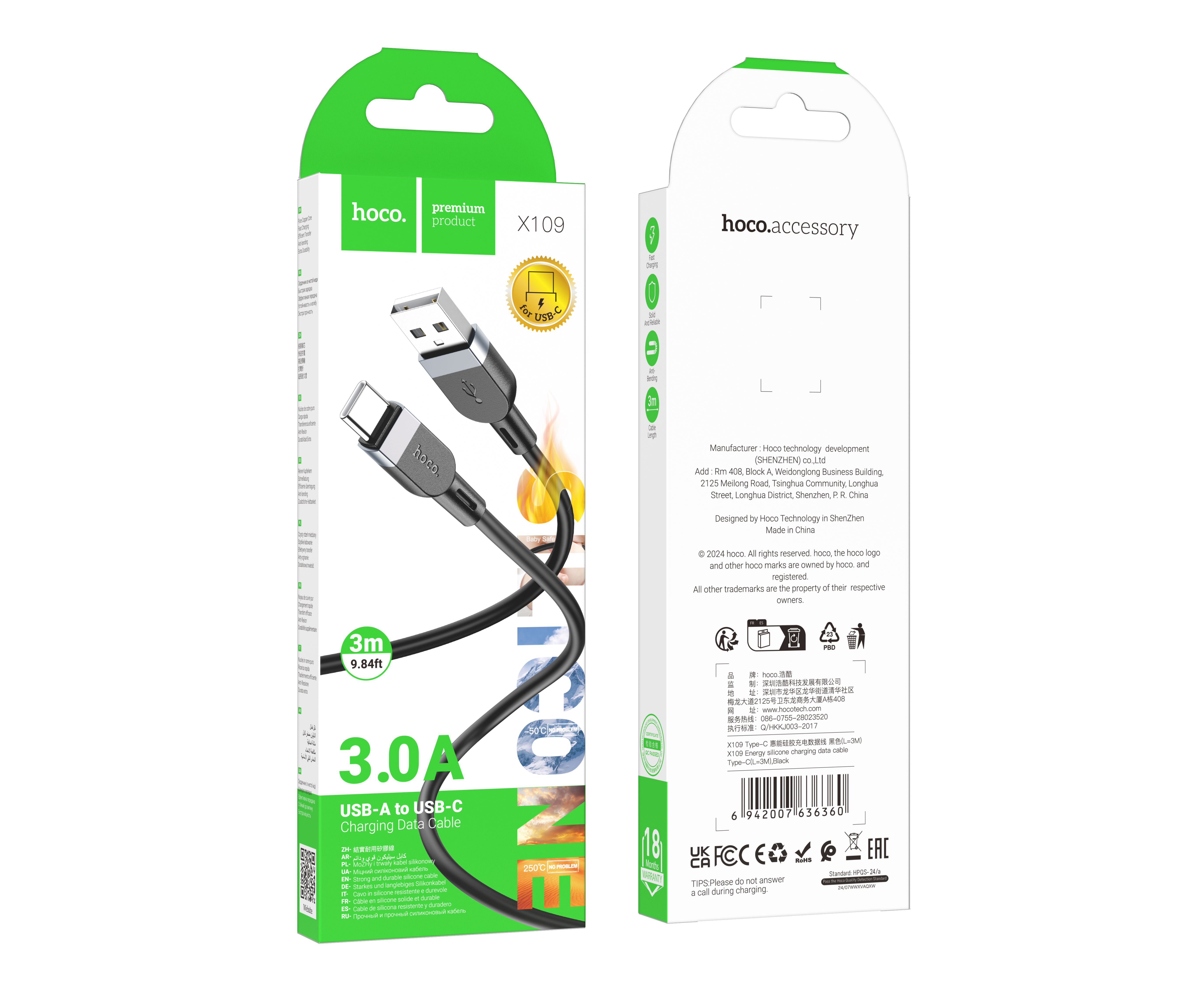 Дата-кабель HOCO X109 Energy silicone Type-C(L=3M) (черный)
