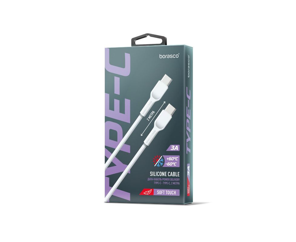 Кабель Borasco c разъёмами USB Type-C и USB Type-C имеет силиконовый материал оплётки, а покрытие Soft Touch передаёт приятные тактильные ощущения. С помощью данного кабеля можно синхронизировать с компьютером смартфоны, планшеты и другие устройства, а сила тока 3A позволит быстро зарядить Ваше гаджет.